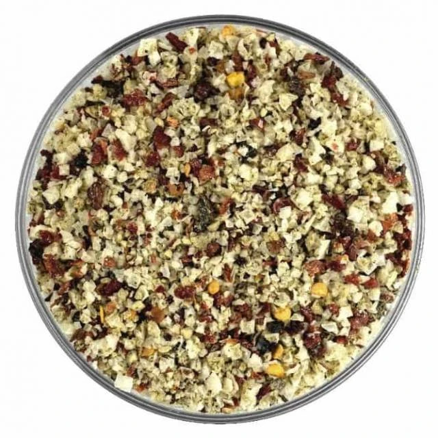 Kann Spuren von Sesam, Sellerie, Lupinen, Schalenfrüchten, Erdnüssen, glutenhaltigem Getreide und Soja enthalten.