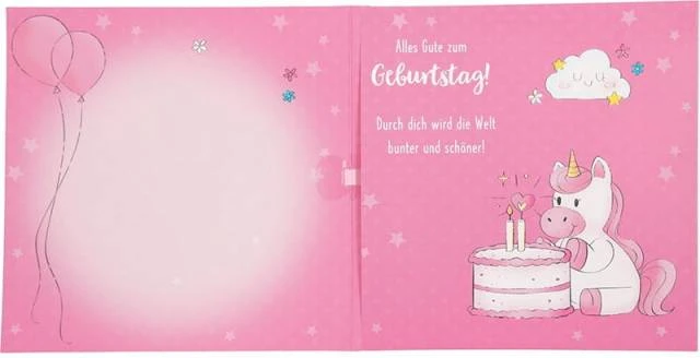 Depesche Glückwunschkarte zum 2. Geburtstag in Rosa mit einer kleinem Einhorn vorne.