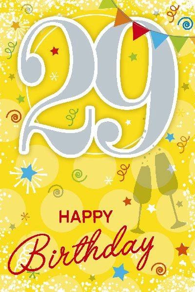 Depesche Glückwunschkarte zum 29. Geburtstag in Gelb mit Spruch * HJappy Birthday * vorne. Die Geburtstagskarte zum 29. Geburtstag spielt das Lied * let´s get loud *.