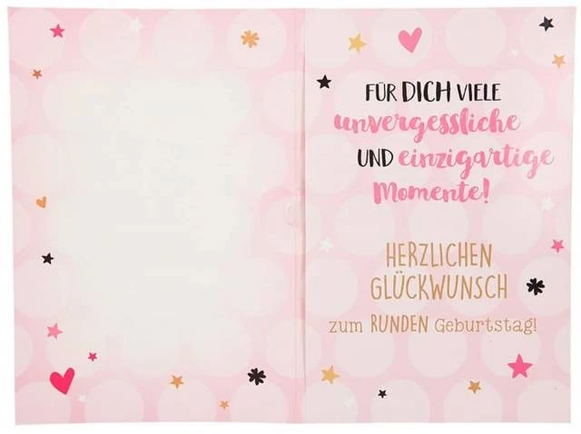 Im Innenteil steht: * für dich viele unvergessliche und einzigartige momente – Herzlichen Glückwunsch zum runden geburtstag *