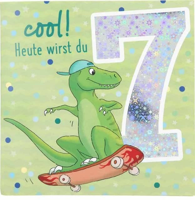 Depesche Glückwunschkarte zum 7. Geburtstag in Grün mit einem Dino vorne. Die Geburtstagskarte zum 7. Geburtstag spielt das Lied * Chciks and Balls *.