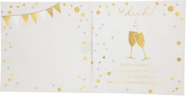 Im Innenteil steht: * Auf dich! Herzlichen Glückwunsch zu diesem besonderern Geburtstag und für das neue Lebensjahr Gesundheit, Glück und schöne Augenblicke *