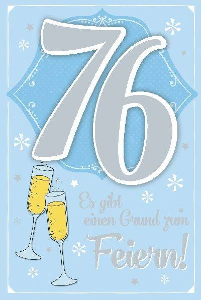 Depesche Glückwunschkarte zum 76. Geburtstag in Blau mit Spruch * Es gibt einen Grund zum Feiern ! * vorne. Die Geburtstagskarte zum 76. Geburtstag spielt das Lied * Congratulations *.