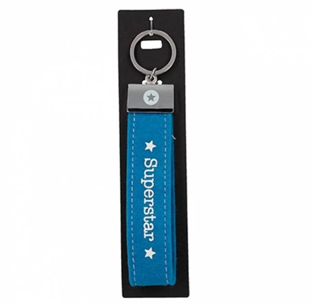 Blaues Filz-Schlüsselband mit Aufschrift Superstar Chrom Applikation oben mit Gravur eines Sternes sowie Metall Key Ring aus der Depesche Serie Glücksfilz Schlüsselband.
