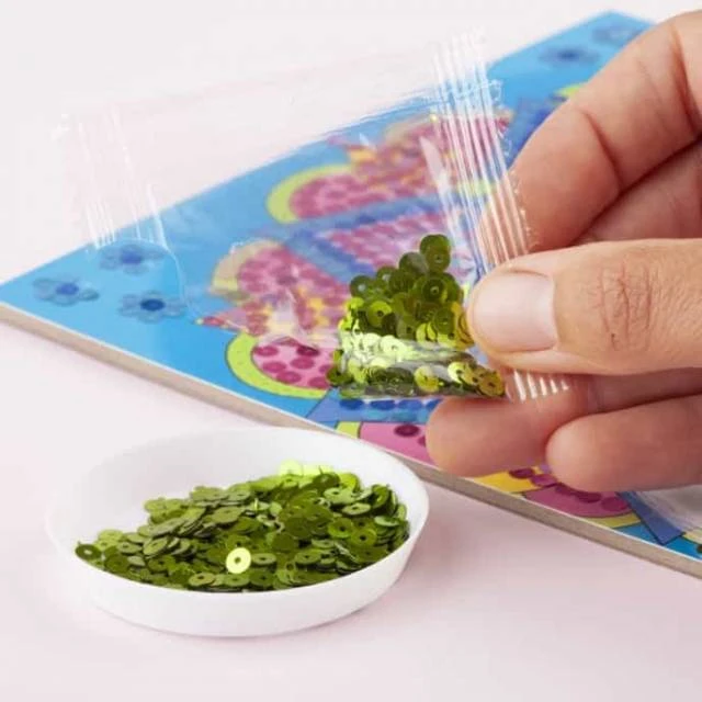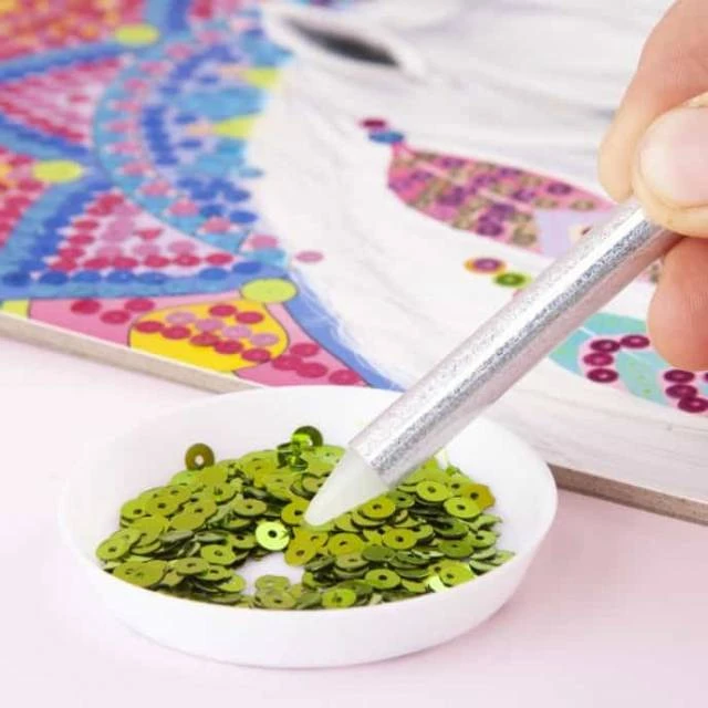 Dazu einfach die mitgelieferten Pailletten mit dem im Lieferumfang enthaltenen „Sticks“ auf die Bildvorlage anbringen und schon ist das schöne Bild fertig und kann an die Wand gehängt werden.