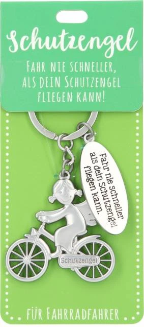 Die Schutzengel Anhänger hat ein kleines Fahrrad mit Schutzengel als Motiv und den Spruch: Fahre nie schneller als dein Schutzengel fliegen kann.