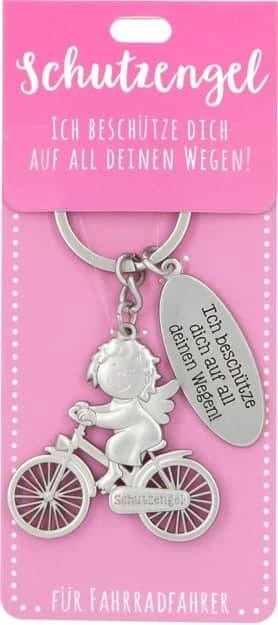 Die Schutzengel Anhänger ist aus Metall und hat einen Schutzengel auf einem Fahrrad als Motiv.
