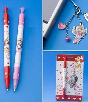 Mit Herzen besetzter Kugelschreiber und dazu ein süßen Schutzengel Handyanhänger mit Herzen und einem kleinen Schild wo mein Schutzengel drauf steht.