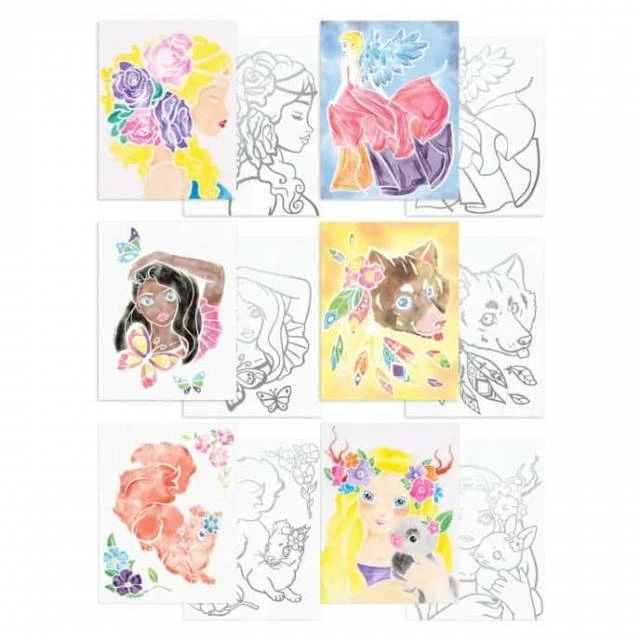 Durch die mitgelieferten Wasserfarben und Pinsel kann man sofort loslegen und die schönen Bilder ausmalen.