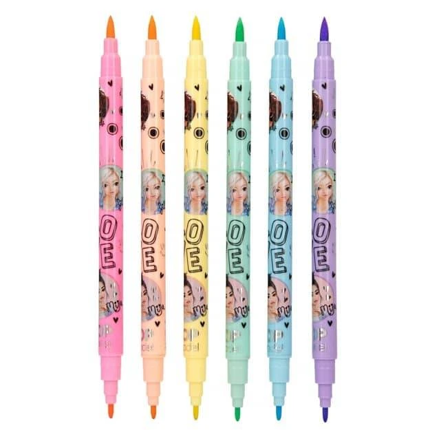 Pastel Fasermaler Set im TopModel Design – das sind 6 Stifte die jeweuls eine Pinsel Sptize und eine Flizstift Spitze (1 mm) haben.