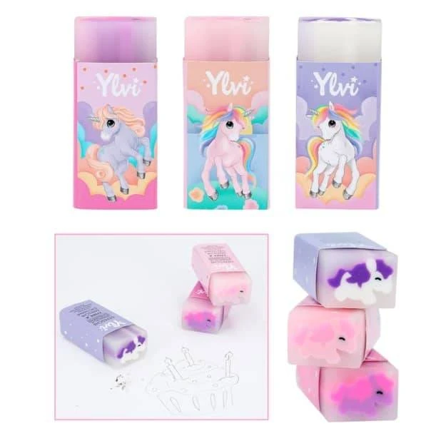 So süß geht Radieren: Die 3 Jelly Radierer von Ylvi sind außen transparent und haben innen ein niedliches Einhorn (Lila/Pink, Weiß/Violett, Rosa/Pink). Mit farblich passender, liebevoll gestalteter Banderole. In Folie verpackt.