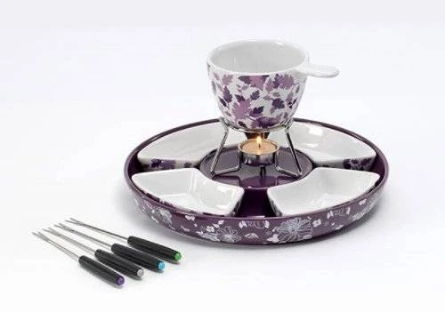 Das Fondue Set Blätter besteht aus 4 kleinen Schüsseln und 1 Fondue Schüssel sowie 4 Fonduegabeln.