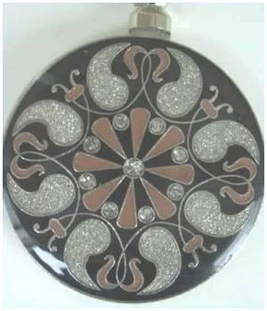 Handtaschenhalter in Rund mit schwarz / Silber / Braun Muster – Durchmesser ca. 3,5 cm – aus dem Hause JBS Glanzlichter. Legen Sie einfach den Handtaschenhalter auf den Tisch im Bistro / Restaurant und hängen Ihre Tasche dran – fertig – Das Ideale Geschenk für alle Frauen.