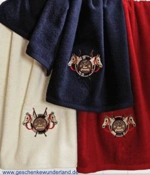Handtuch aus flauschiger Baumwolle (Walkfrottier) aus der Morgenstern Kollektion Pferdewappen in Ecru (Beige) mit Pferde Stickerei in der Größe ca. 50 x 100 cm.
