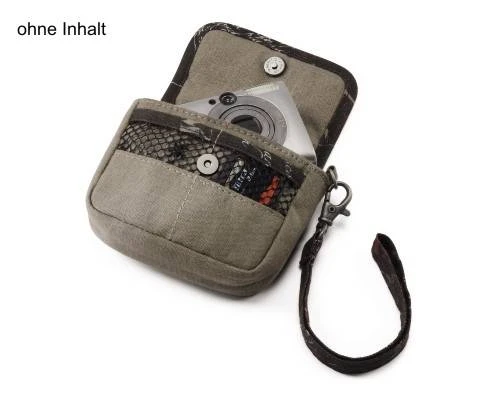 Kleine Nici Tasche in Grün für z.b.: Digitalkamera mit Druckknopf aus Baumwollstoff mit abnehmbarem Trageriemen, kleiner Aussentasche mit Reißverschluß und Gürtelschlaufe aus der Kollektion Melinda (Ameise) und Mo (Kamel) – Größe ca. 11,5 x 3 x 8,5 cm