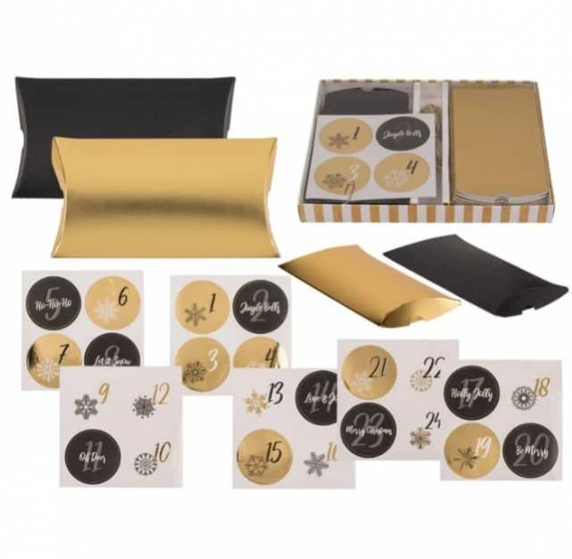 Die 24 Schachteln sind in Schwarz oder Gold (jeweils 12 Stück) gehalten und haben die Form eines Kissens – größe ca. 12,5 x 7 , x1,5 cm.