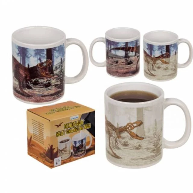 Der Coole T-Rex Dino Becher verwandelt sich, sobald etwas warmes in die Tasse kommt, denn dann ist auf einmal der T-Rex nur noch ein Skelett.