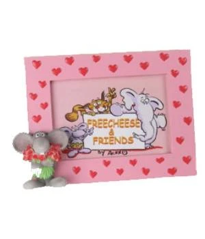 Rosaner Bilderrahmen mit Herzen verziehrt, an der Seite steht eine kleine Maus mit einem großen Blumenstrauß. Der Bilderrahmen hat eine Größe von ca. 17 x 13 cm und ist für Fotos 13 x 9 cm. Die Maus in der Ecke hat eine Höhe von ca. 5 cm. Rahmen und Figur ist aus Polyresin.