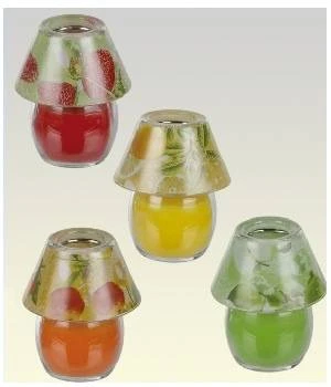 Wunderschöne kleine Glaslampe mit einer Duftkerze Integriert. Die Kerze mit Glaslampe hat eine Höhe von ca. 9 cm und wird in einer Klasichtbox geliefert. Die Brenndauer der Duftkerze ist ca. 10 Stunden. Verschiede Düfte stehen zur Auswahl. Der Lampenschirm ist mit den jeweiligen Düften verziehrt.