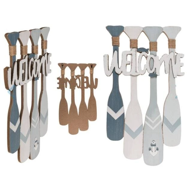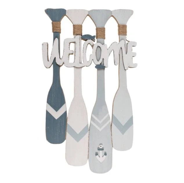 4 Schiffs-Paddel sind hier aneinander gereit und haben oben drauf das Wort * Welcome *
