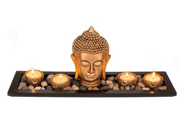 Im Buddha Set sind neben dem Holtztablett noch ein Bronzefarbender Buddha Kopf, 4 kleine Teelichthalter inkl. Teelicht und ein paar Dekostein.