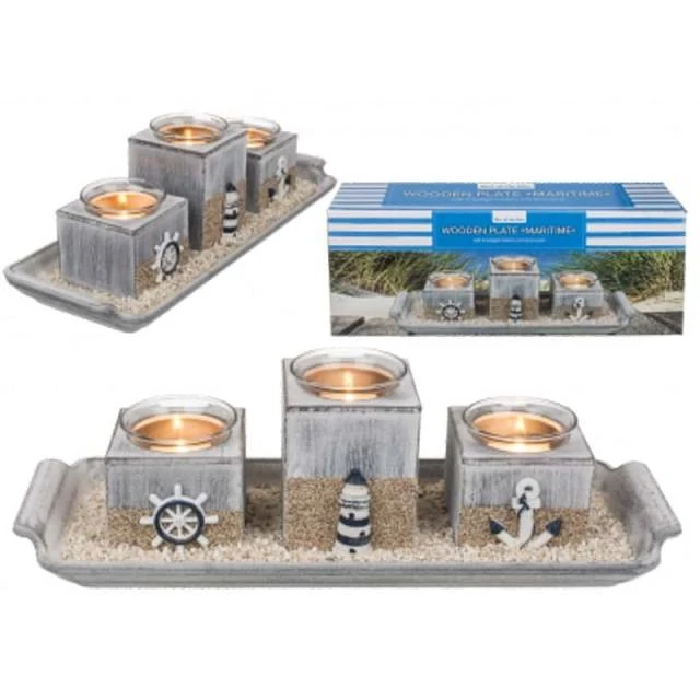 Im Maritim Teelichthalter Set sind neben dem Holtztablett noch ein 3 kleine Teelichthalter mit Anker, Leuchtturm und Steuerrad Motiv enthalten.
