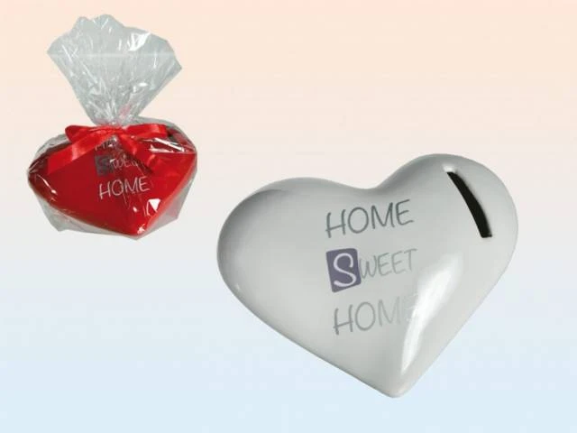 Auf der Herzspardose steht geschrieben Home Sweet Home und es ist in einer Zellophantüte eingepackt.