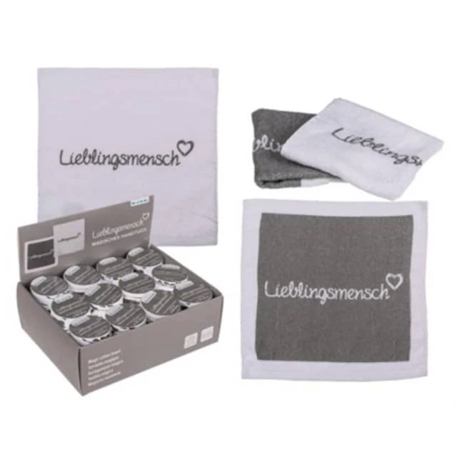 Kleines Gästehandtuch mit Aufschrift Lieblingsmensch was ganz klein gepresst wurde und wenn man es ins Wasser legt größer wird.