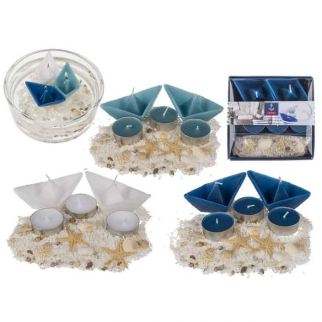 Ein sehr schönes Maritimes Kerzenset kommt hier von Out oft he Blue und bringt Ihnen in einem kleinen Geschenkkarton Teelichter, Schiffchen als Kerze sowie Deko Elemente.