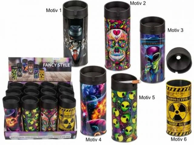 Metall Aschenbecher mit verschiedenen Motiven wie Totenkopf, Alien und vieles mehr.