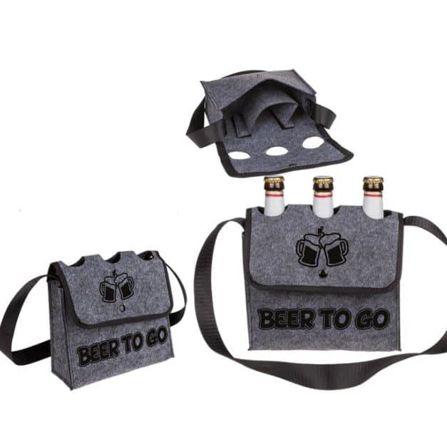 Die graue Umhängetasche mit Aufschrift Beer to Go ist das passende Geschenk für alle Männer oder diejenigen die gerne Beer trinken. Denn hier passen genau 3 Bierflaschen Exakt rein und können hervorragend transportiert werden.