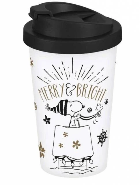 Coffee to Go Becher mit Peanuts Snoopy und Woodstock sowie der Aufschrift Merry & Bright in Weiß