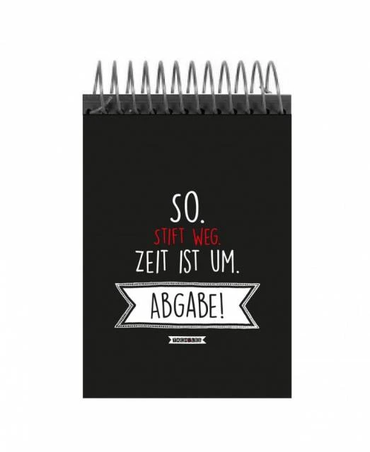 Vorne auch dem Tacheles Schreibblock steht: So – Stift Weg – Zeit ist um – Abgabe