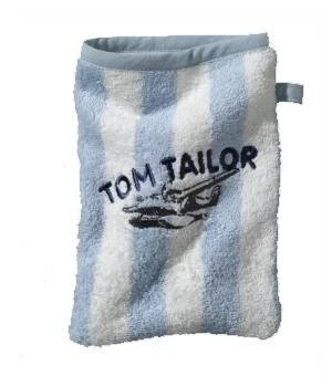 Aus der Kollektion Palm Springs kommt dieser schöne Blau / Creme Farbende Waschhandschuh von Tom Tailor. Vorne sehen Sie eine schöne Stickerei – Schriftzug Tom Tailor und ein Wasser – Flugzeug. Sehr flauschig und weich.