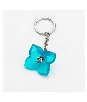 Blumenförmiger Schlüsselanhänger in Blau mit einem runden Swarovski Kristall in der mitte, aus flexiblen Kunststoff und bleifreiem Messing/Stahl – Größe ca. 2,8 cm.