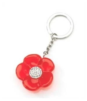Blumenförmiger Schlüsselanhänger Twinklets Red Bliss mit Swarovski Kristallen in der mitte aus flexiblen Kunstoff in der Größe ca. 45mm. Schlüsselring und Kette sind aus bleifreiem, vernickeltem, rostfreiem Edelstahl.