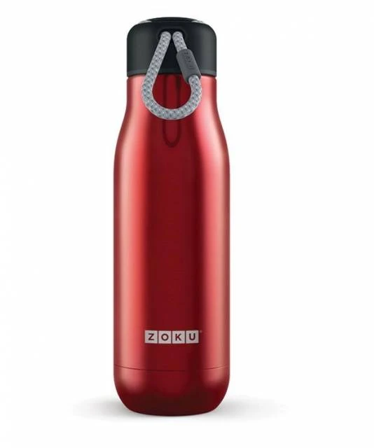 Die Zoku Trinkflasche – hier in einem Metallic Rot – überzeugt nicht nur in Ihrem schicken Design sondern hat auch so einiges zu beiten.
